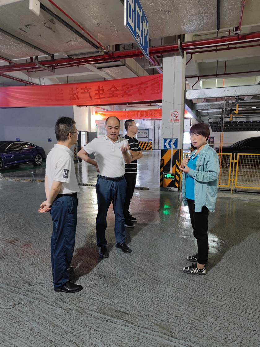 在濮家地下车库,方晓副总经理检查了机械泊位等特种作业设备,强调要重视梅雨季节车库的防潮除湿,避免地面湿滑导致的行车安全事故发生,未雨绸缪做好防汛抗台准备,随时做好应对突发情况的准备。