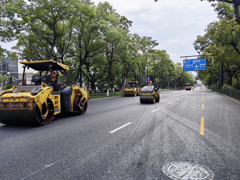 为保证施工顺利进行,确保完成节点目标,环北天目指挥部克服工期紧、任务重、交通流量大、中高考期间无法施工等诸多困难,充分发挥“能吃苦、能战斗”的铁军作风,严格落实施工单位采取多种措施加大人员力量、机械设备投入。充分利用半夜12点后车辆较少的时间段,现场协调指挥解决施工推进中存在问题。最终克服雨季等不利条件,抢抓晴好天气,高效有序完成了全部沥青摊铺施工。