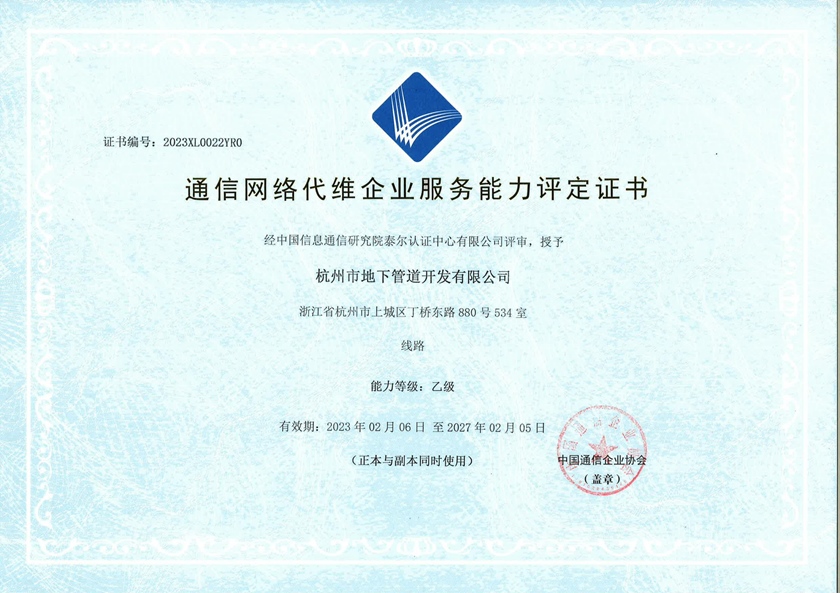 近日,集团所属地下管道公司在维护业务板块再次取得突破性进展,一次性通过了中国信息通信研究院泰尔认证中心的审核,成功取得中国通信企业协会颁发的综合代维(乙级)、基站专业代维(乙级)、线路专业代维(乙级)、装维一体化专业代维(乙级)四项服务能力认证。